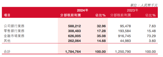 同期,金融市场业务税前利润为6.26亿元,同比下滑了31.65%,占比从2023年的73.29%下滑至35.08%。