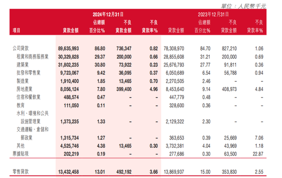 而公司类不良贷款主要包括租赁和商务服务业、房地产业、建筑业,占公司类不良贷款总额的91.44%。尤其是房地产业,不良贷款率达到4.96%。