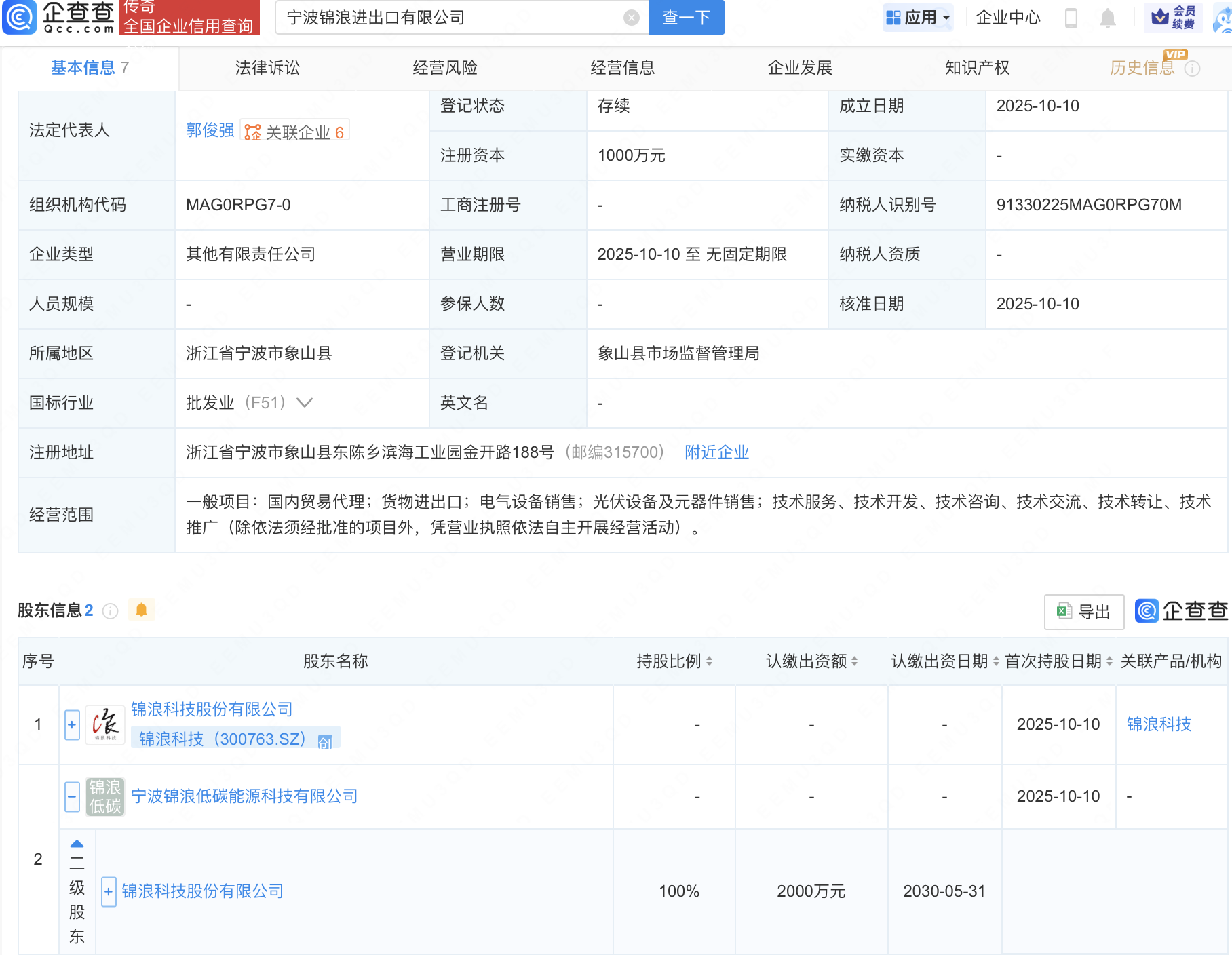 近日,宁波锦浪进出口有限公司成立,注册资本1000万元,经营范围包含:国内贸易代理;货物进出口;电气设备销售;光伏设备及元器件销售等。企查查股权穿透显示,该公司由锦浪科技(300763)间接全资持股。