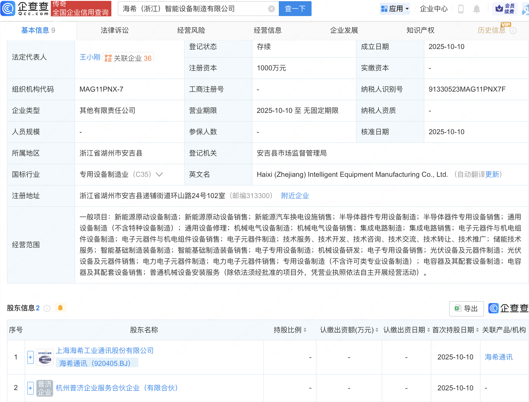 近日,海希(浙江)智能设备制造有限公司成立,注册资本1000万元,经营范围包含:半导体器件专用设备制造;半导体器件专用设备销售;集成电路制造;集成电路销售等。企查查股权穿透显示,该公司由海希通讯(920405)等共同持股。